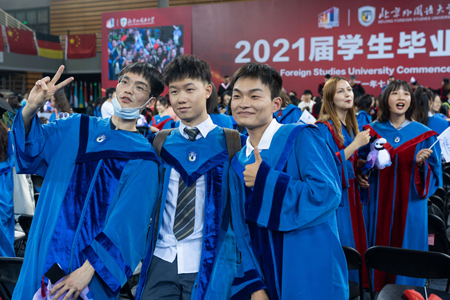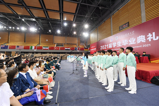 典礼正式开始前,北外参与庆祝中国共产党成立100周年大会的同学们再次通过深情的歌声与铿锵的诵读,与在场的毕业生们一起,为建党百年献上最真诚的祝福。