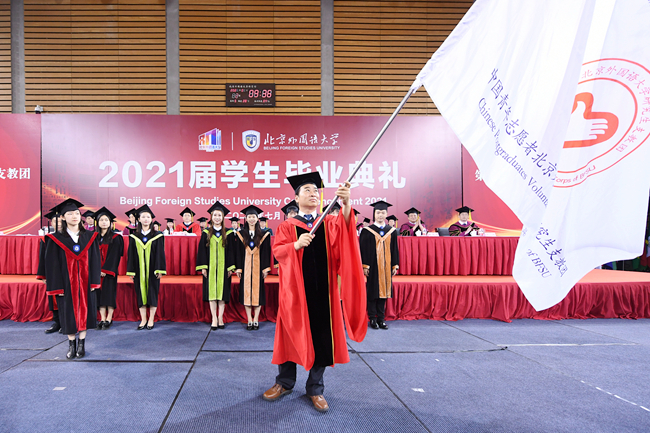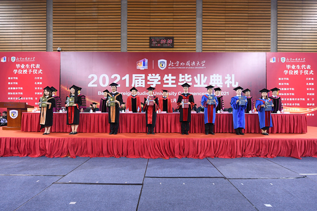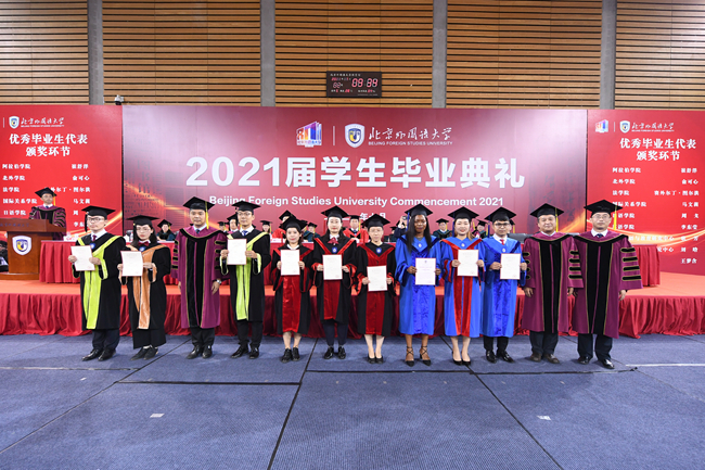 孙有中宣读了《bat365官方官网关于表彰2021届优秀毕业生的决定》。今年,北外共有123名同学荣获“北京市优秀毕业生”荣誉称号,260名同学荣获“bat365官方官网优秀毕业生”荣誉称号。胡志钢、丁浩、赵刚为获得“优秀毕业生”荣誉称号的毕业生代表颁发了证书。