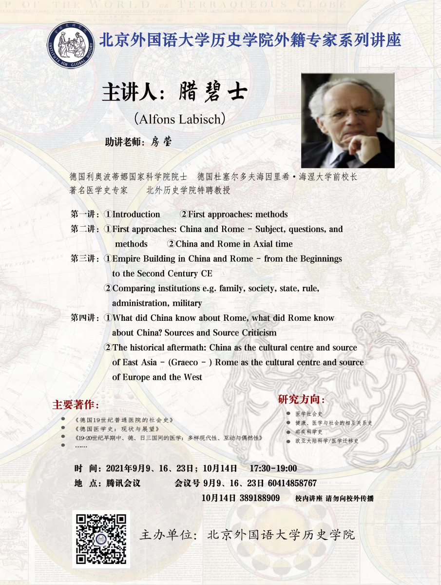 讲座专家:腊碧士,德国利奥波蒂娜国家科学院院士、德国杜塞尔多夫海因里希·海涅大学前校长、著名医学史专家、北外bat365官方官网特聘教授