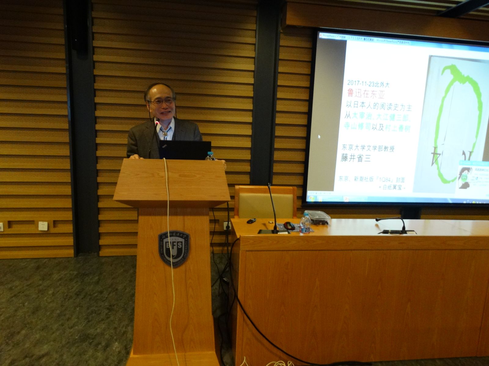 接下来,藤井教授介绍了鲁迅作品首次被介绍至东亚日韩两国的历史情况。并具体分析了鲁迅与四位日本作家通过作品内容描写或对彼此作品做出评价等方式而产生的交流互动,勾勒出“鲁迅在东亚”的生动图景。第一,对于鲁迅与太宰治,太宰治完成了世界文学中唯一一部以鲁迅为主人公的长篇小说。第二,关于大江健三郎和鲁迅的关系,早年受母亲教育影响,鲁迅的形象就在大江心中扎根,晚年作品《晚年样式集》最后一页的一篇诗中一节,可以清晰看到鲁迅1925 年作品《野草·希望》的相似思想。第三,藤井教授通过引用彭琳论文,详细比较了寺山修司与鲁迅,寺山对鲁迅作品《娜拉走后怎样》体现的女性观,《阿Q 正传》体现的大众观都进行了根本批判,而这样的批判正是源于对鲁迅的深深同感,观点新颖。第四位通过介绍中国读者十分熟悉的村上春树,与鲁迅作品进行了对比分析,清晰展现出二者的相关性。