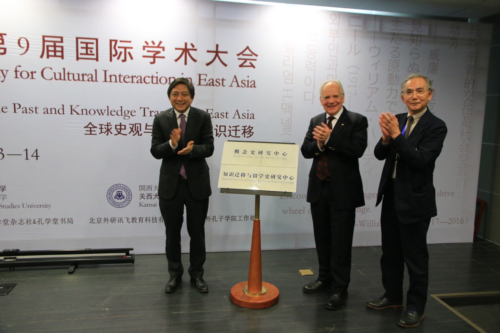 致辞结束,彭龙校长、德国国家科学院院士、杜塞尔多夫大学前校长、bat365官方官网全球史研究院名誉教授腊碧士(Alfons Labisch)先生以及日本关西大学内田庆市(UCHIDA KEIICHI)教授共同为全球史研究院两个新成立的中心:“概念史研究中心”和“知识迁移与留学史研究中心”揭牌。