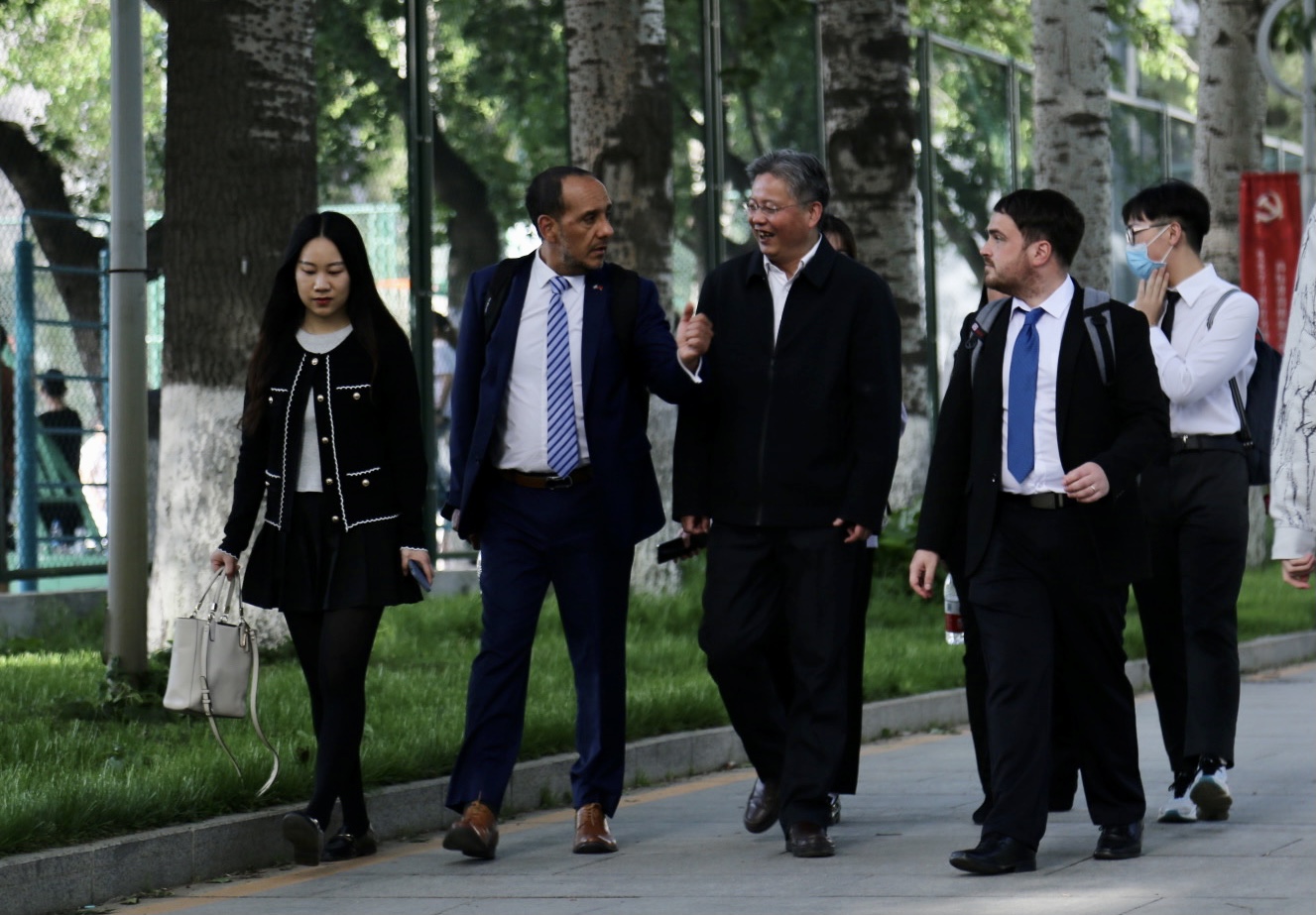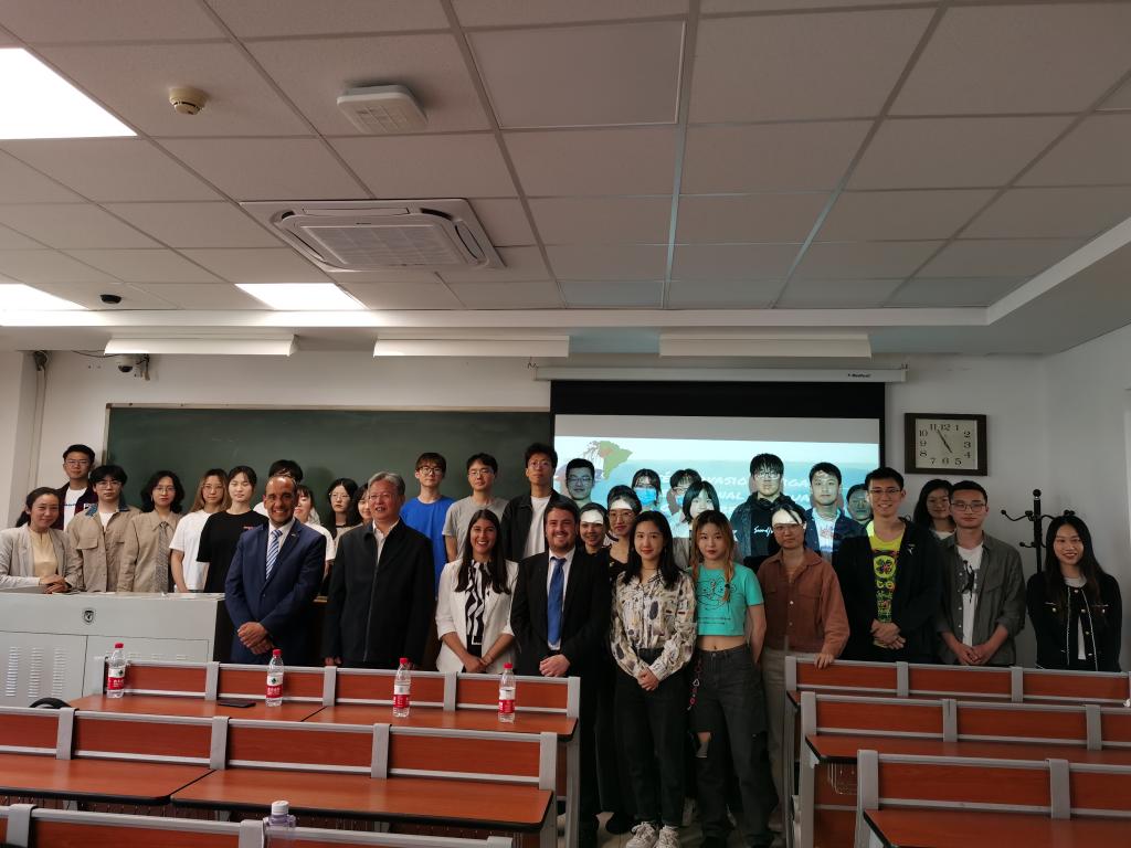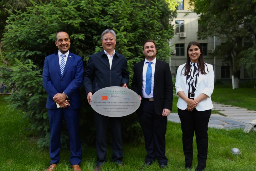 讲座结束后,在pp电子官方网站院长常福良的陪同下,乌拉圭驻华使馆领事塞尔西奥·德亚巴列、潘慧敏老师、张哲海老师一起参观了北外校园的“中国—乌拉圭友谊树”。